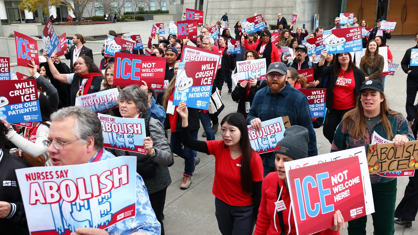 After the murder of Alex Pretti – a VA nurse and AFGE union member, executed by federal agents in January as a consequence of the federal occupation of Minnesota – NNU sprung into action to condemn the murder and called to abolish ICE to curb their violent terror campaign. By taking up the call to abolish ICE, NNU is expanding what it means to defend their workplaces against new threats growing under the Trump administration. Healthcare workers are making the case that protecting patients requires confronting the broader systems that are harming them outside the hospital walls.